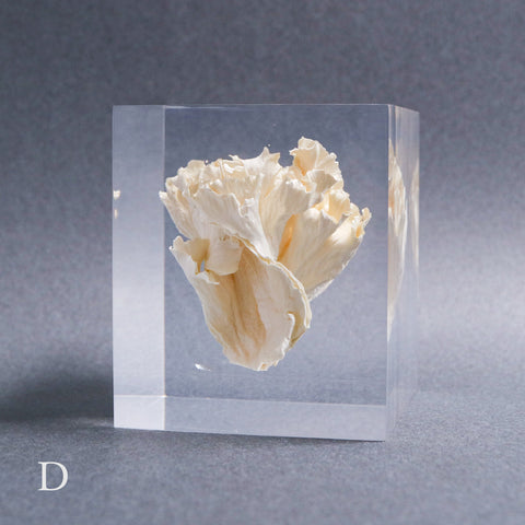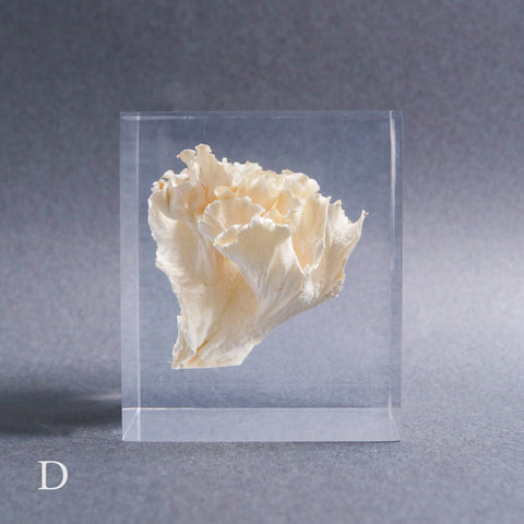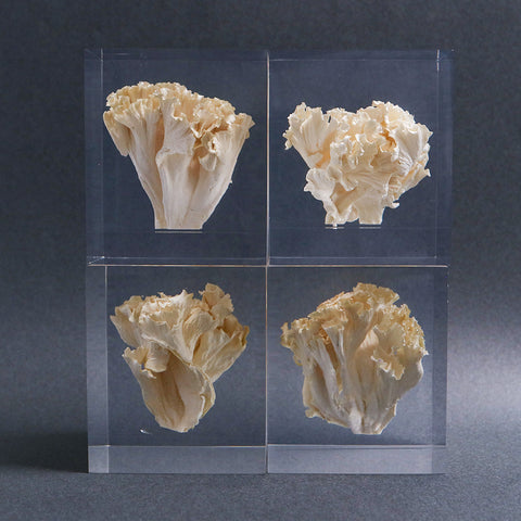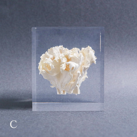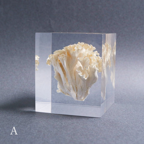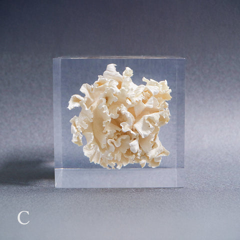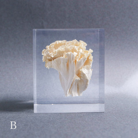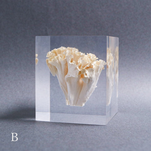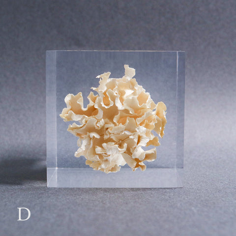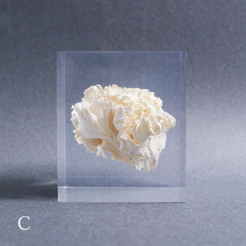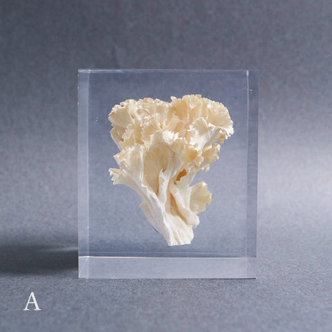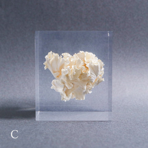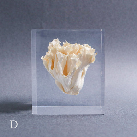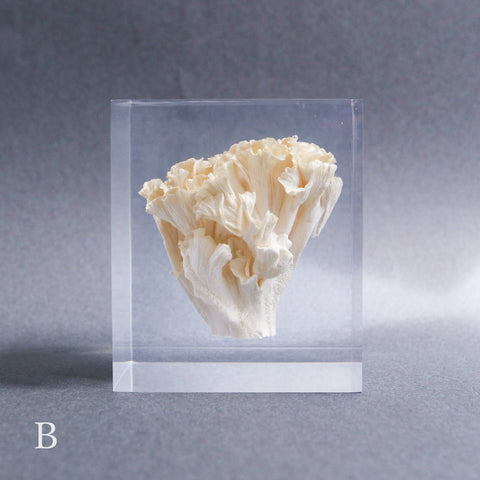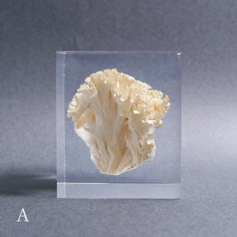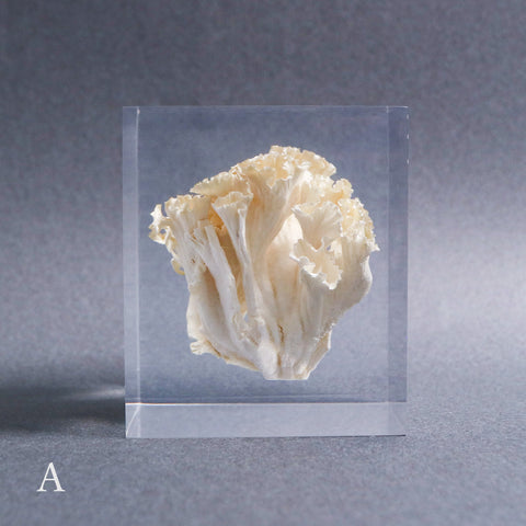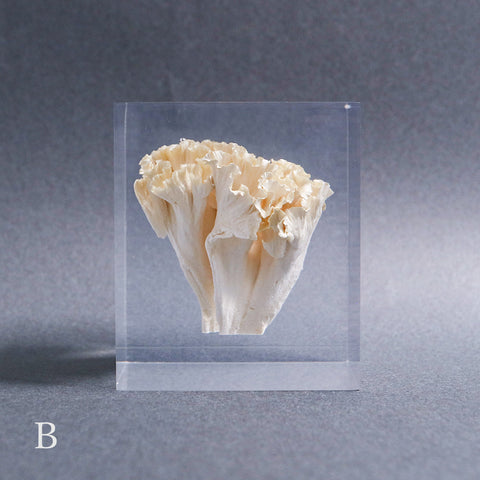 This acrylic specimen captures the pure beauty of the Sparassis crispa (the cauliflower mushroom), a rare fungus that grows at the base of conifer trees. Its white, petal-like form symbolizes purity and harmony with nature.